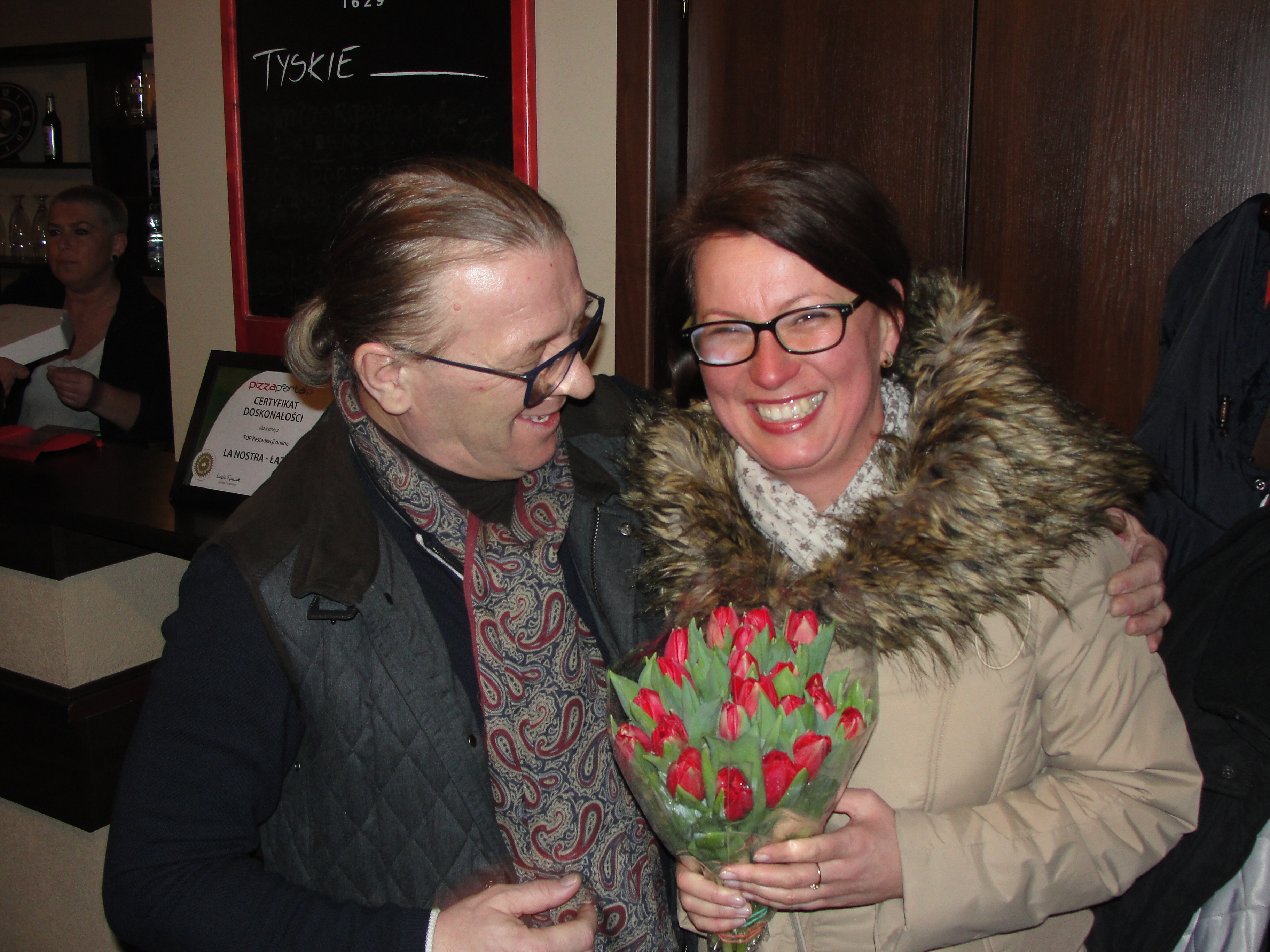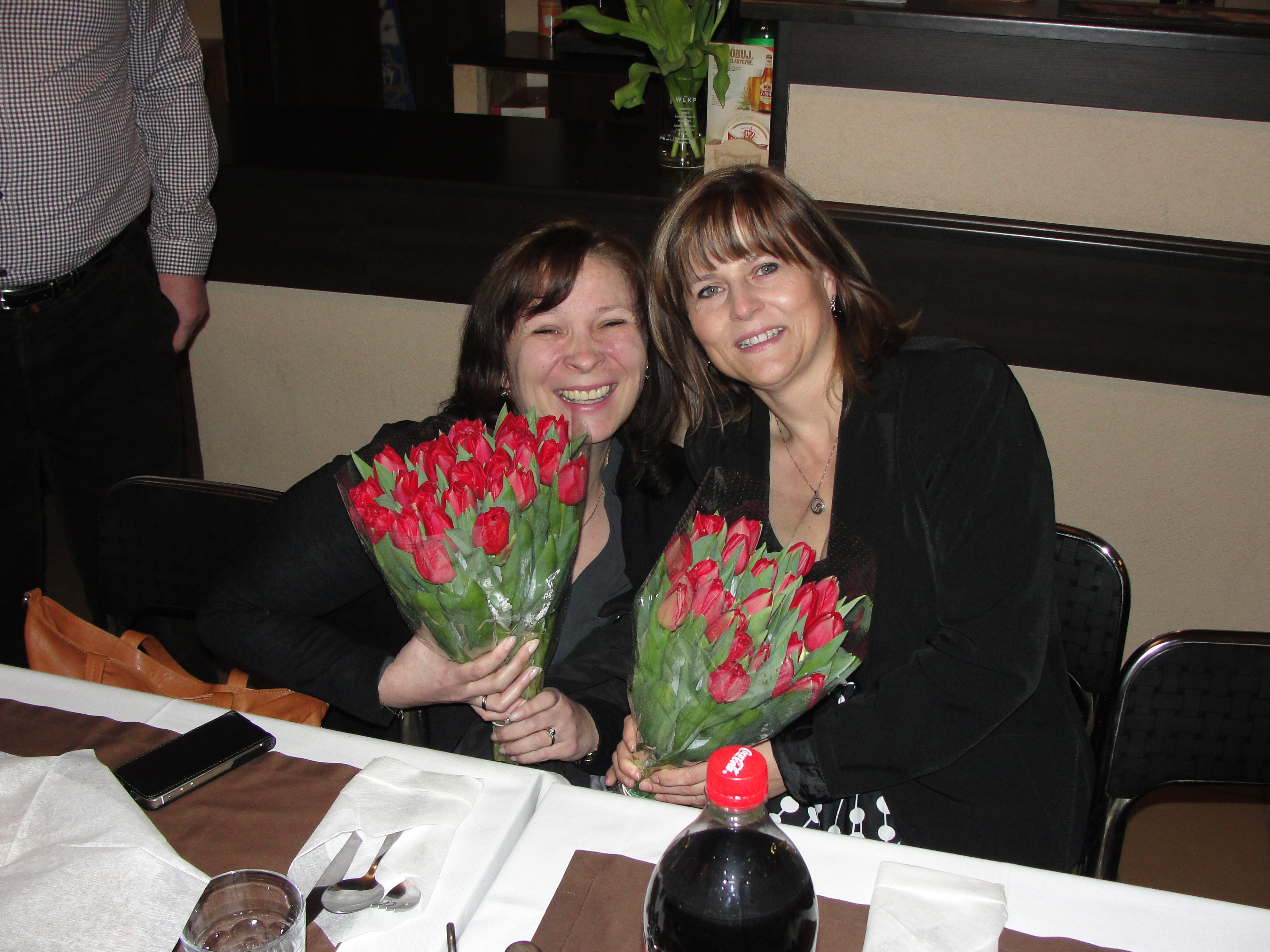 A teraz po kolei , po kilku miesiącach przerwy zarezerwowaliśmy salę w zaprzyjaźnionym lokalu u Jacka . I tuż po godzinie 18 kiedy wszyscy zbieraliśmy się w naszej specyficznej pizzerii w pierwszej kolejności zaatakowaliśmy nasze Panie. Były kwiaty , życzenia i buziaki no bo przecież nasze Panie są kwiatem naszego Klubu , tym co w nas najładniejsze.