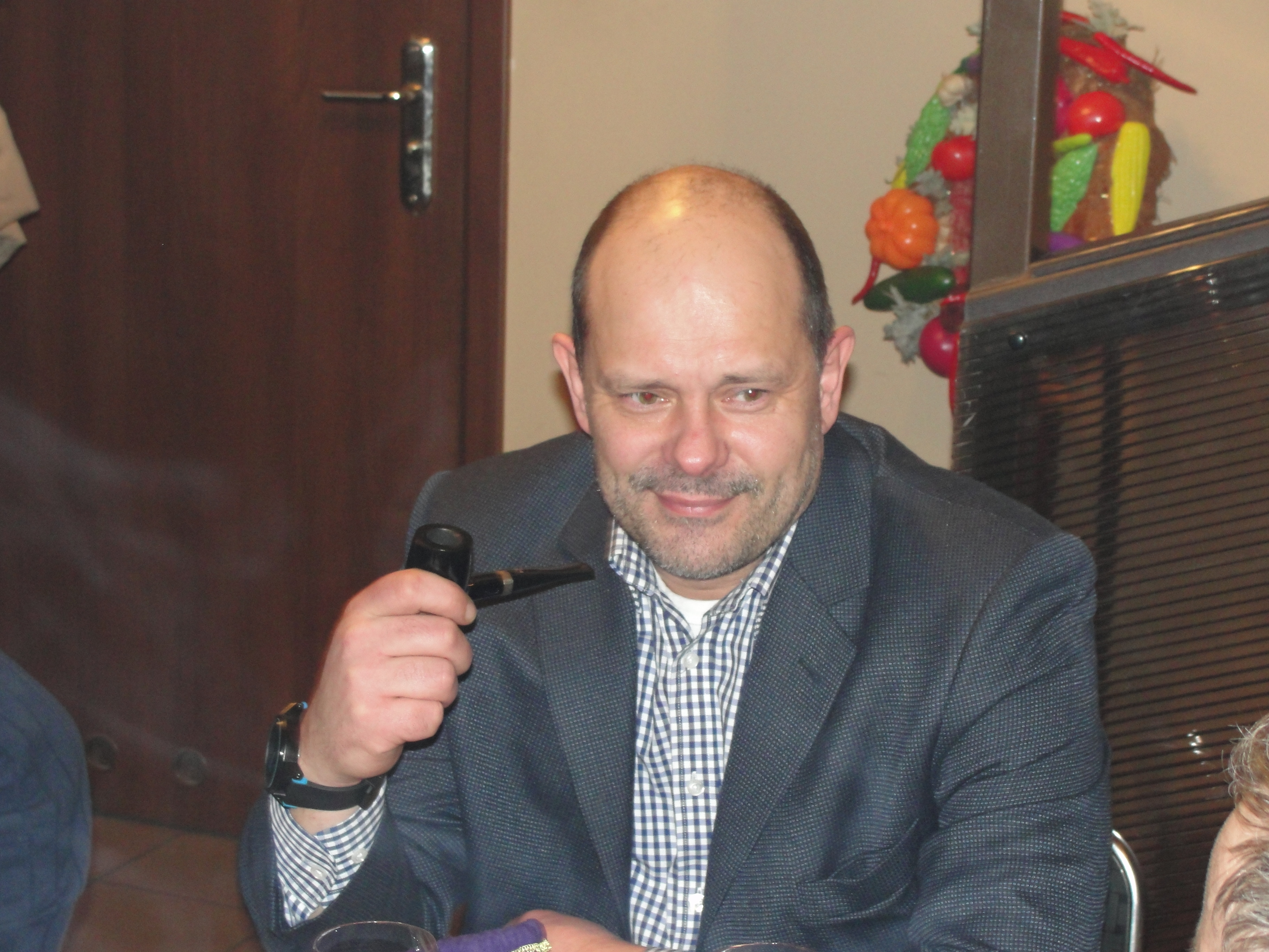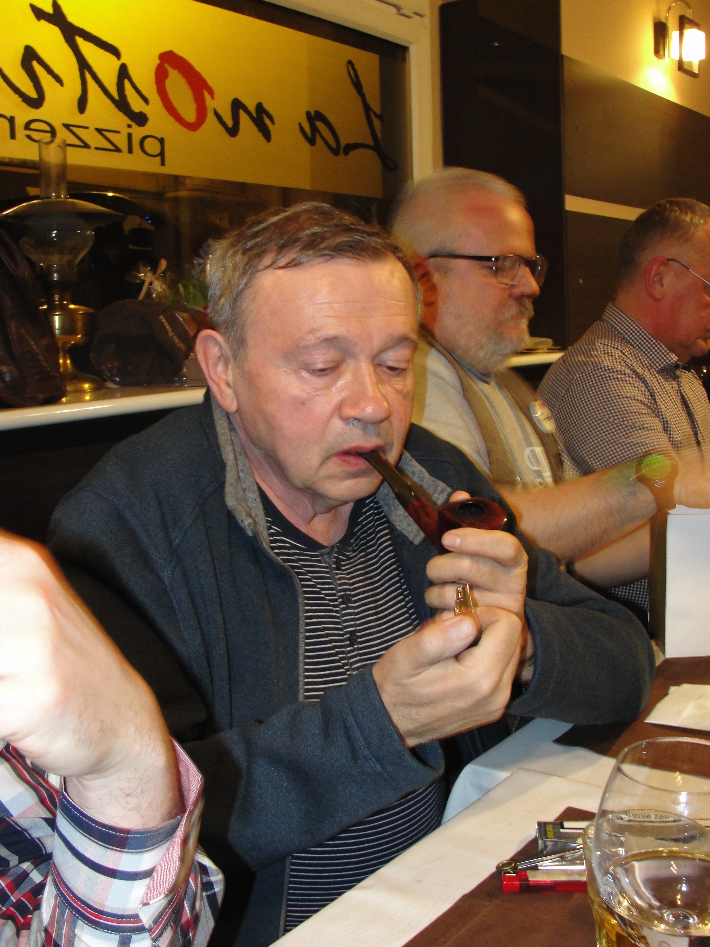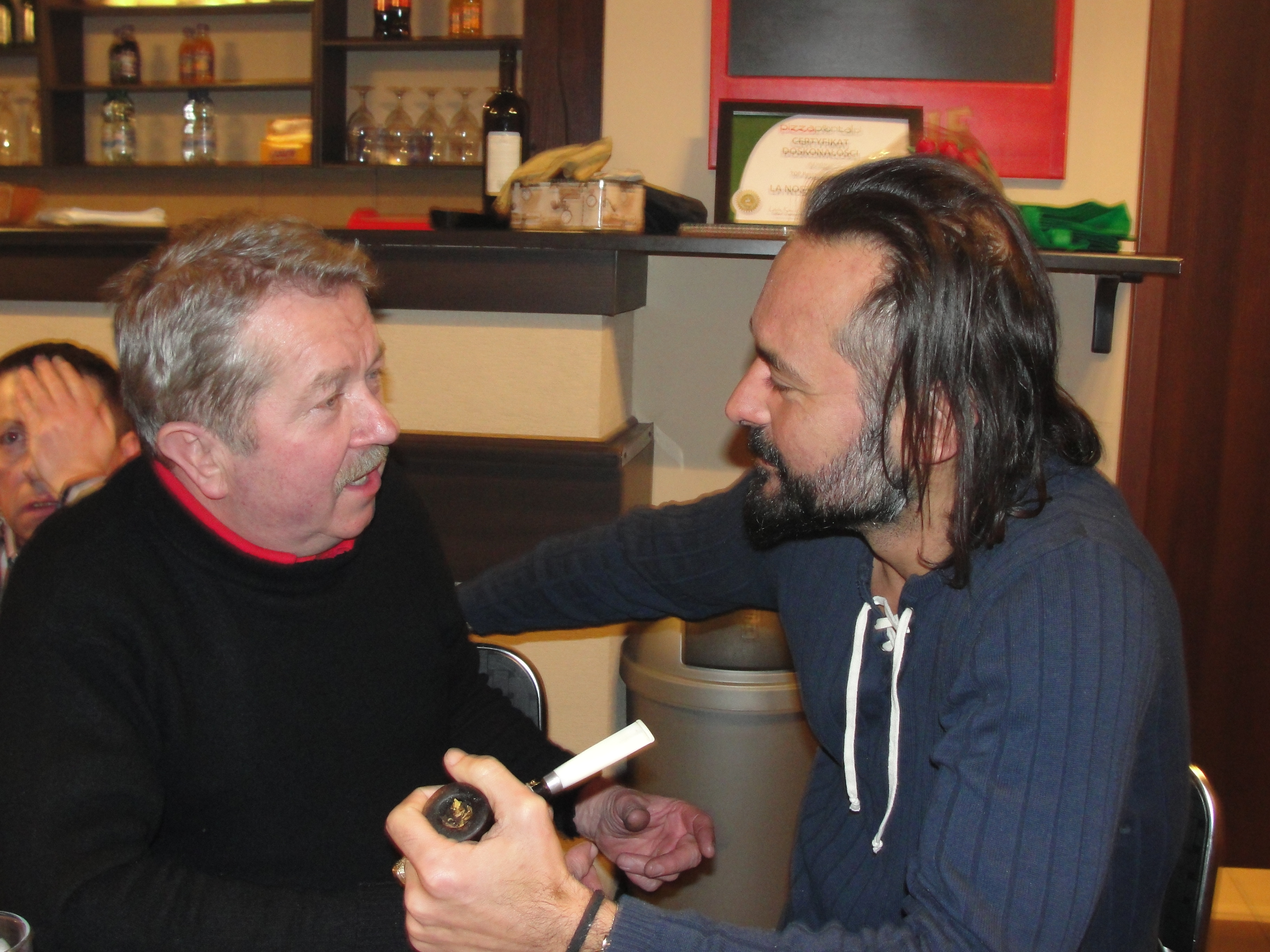 Jednym z nich był honorowy członek naszego Klubu przedstawiciel tej międzymiastowej wersji spotkania, przedstawiciel Przemyskiego Klubu Fajki a zarazem nieoceniony mistrz produkcji wyrobów wspaniałych Henryk Worobiec oraz będący reprezentantem tej międzykulturowej wersji spotkania , również miłośnik fajek i aromatycznego dymu poeta, pianista, kompozytor, tłumacz, prezes Zwiazku Literatów Polskich oddziału w Poznaniu, zasłużony dla kultury polskiej, lider i wokalista , syn pochodzącego z Grecji poety, pisarza i historyka literatury, Nikosa Chadzinikolau – nasz serdeczny przyjaciel Ares Chadzinikolau.